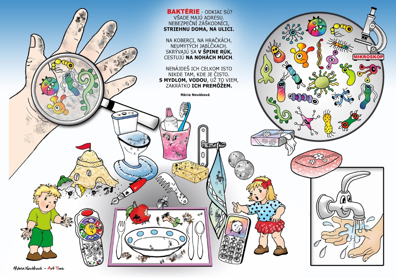 Deťom vysvetlíme, že baktérie a vírusy sú všade okolo nás, len ich nevidíme, preto je dôležité poriadne si umývať ruky, aby sa nám nedostali do tela. Vyskúšajte experimenty z videa, deťom sa budú isto páčiť :-)